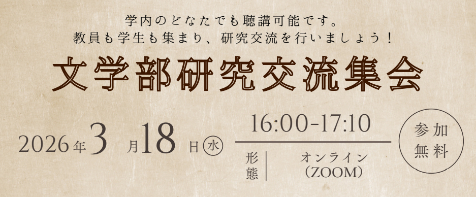 【学内限定】文学部研究交流委員会主催 文学部研究交流集会 文学部では、研究交流集会を定期的に開催しております。 学内のどなたでも聴講可能です。 ■日時:2025年11月19日(水)16:00~17:10 ■開催形態:オン …